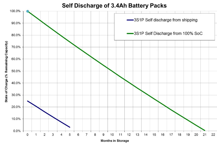 由于鋰離子電池內(nèi)部會(huì)自發(fā)發(fā)生物理和化學(xué)放電,電芯內(nèi)部會(huì)緩慢地產(chǎn)生自放電,從而失去電荷,導(dǎo)致化學(xué)能的損失。一般情況下,鋰離子電池每個(gè)月的自放電率為0.5%~3%,對(duì)自放電速率影響最大的是電池的儲(chǔ)存溫度,更高的溫度會(huì)加劇電池內(nèi)部化學(xué)反應(yīng)導(dǎo)致更多的自放電,因此電池的儲(chǔ)存環(huán)境對(duì)電池的壽命有很大影響。