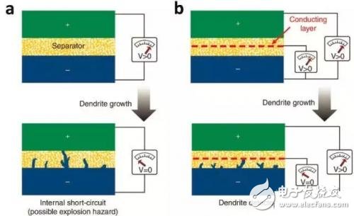 為了解決鋰枝晶生長(zhǎng)導(dǎo)致的內(nèi)短路事故,人們?cè)O(shè)計(jì)了多種方法監(jiān)控鋰離子電池內(nèi)部鋰枝晶的生長(zhǎng)。例如Wu等人設(shè)計(jì)的多功能隔膜,這種隔膜在傳統(tǒng)的聚合物隔膜中間還加入了一層金屬,這層金屬充當(dāng)了鋰枝晶探測(cè)器的功能,通過(guò)監(jiān)測(cè)這層金屬與負(fù)極之間的電壓差,就可以實(shí)現(xiàn)對(duì)鋰枝晶的監(jiān)控,使得該隔膜即保留了傳統(tǒng)隔膜的功能,也實(shí)現(xiàn)對(duì)鋰枝晶的監(jiān)控。斯坦福大學(xué)的KaiLiu三層復(fù)合多功能隔膜,改隔膜的特點(diǎn)是隔膜的中間層加入了SiO2,當(dāng)鋰枝晶生長(zhǎng)到一定程度時(shí),穿刺隔膜時(shí),SiO2會(huì)與金屬鋰發(fā)生反應(yīng),消耗鋰枝晶,從而避免鋰枝晶的進(jìn)一步生長(zhǎng)。